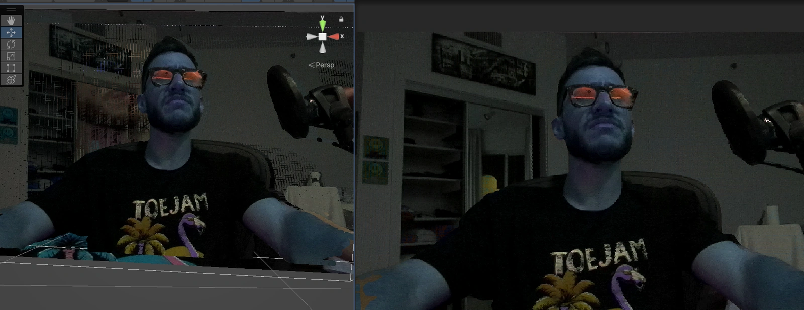 Then I remembered my goal was to hide the particles completely by coloring them based on the color of what was behind them. It’s funny because this was my original intention at the onset and it had slipped my mind due to my excitement of having gotten the point cloud perfectly overlayed on the stream.