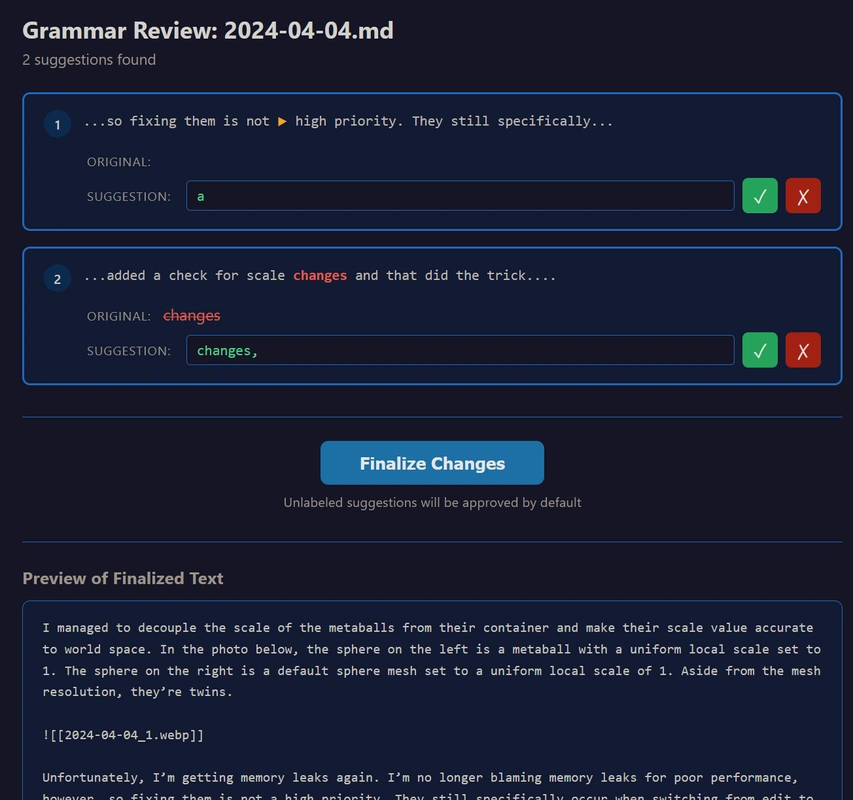 “I’d like to improve my grammar checking system’s UX. Currently, when the system flags an entry for suggested corrections, it launches a text editor window where I need to manually edit the document and then save and close it to accept the changes. The issue is that when there are multiple suggestions i disagree with, it becomes tedious to undo those changes by manually replacing the corrections with the original text . I think a better experience could be had in a browser window. We could launch an HTML page where all the suggestions are shown in a list like they are currently, except that beneath each suggestion, there would be a checkmark button to approve and an X button to reject. The revised text suggestion could be given a text field so that if I wanted to make manual changes to the suggestion I could do so and then approve my changes by hitting the checkmark. The system shouldn’t finalize changes until I hit an “Finalize” button at the bottom. That button should be pressable even if I haven’t approved or rejected all suggestions—if pressed in this scenario, it should assume approval for those unlabeled suggestions. Hitting the finalize button could close the tab”
